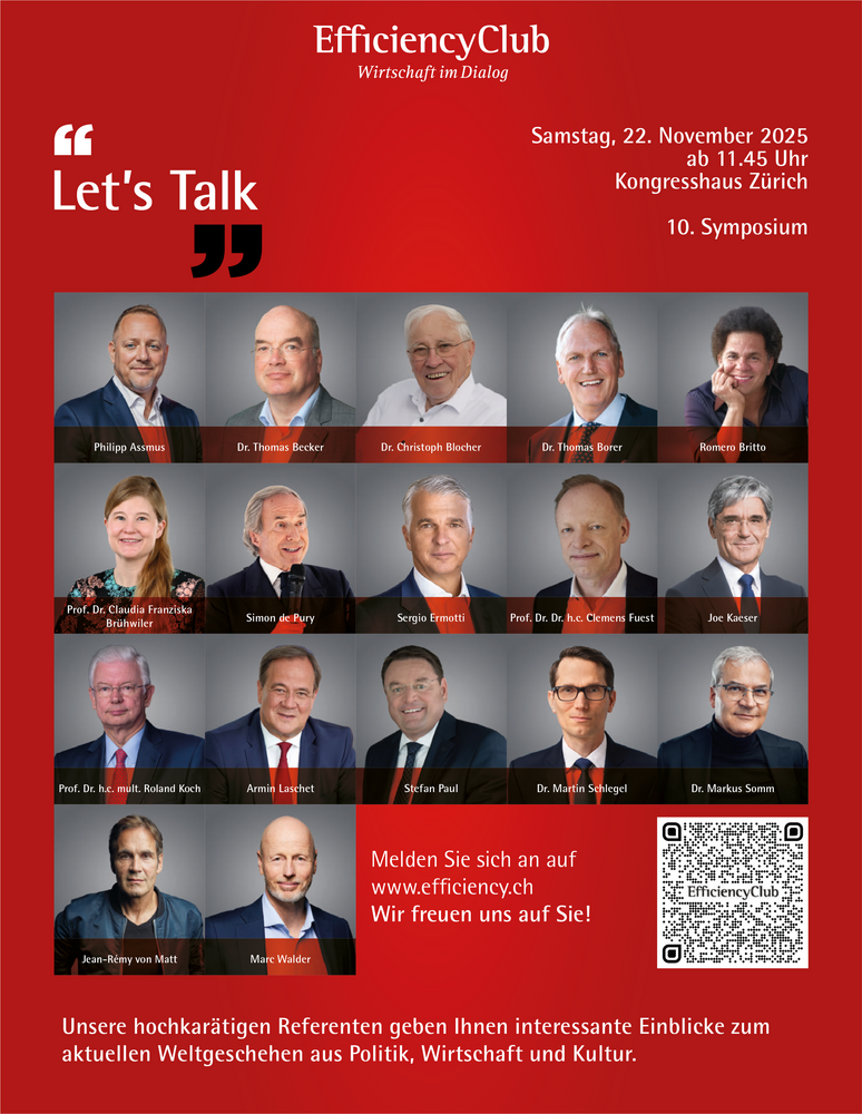Dieses Jahr erwarten wir spannende Beiträge von Philipp Assmus, Dr. Thomas Becker, Dr. Christoph Blocher, Dr. Thomas Borer, Romero Britto, Prof. Dr. Claudia Brühwiler, Simon de Pury, Sergio Ermotti, Prof. Dr. Dr. h.c. Clemens Fuest, Joe Kaeser, Prof. Dr. h.c. mult. Roland Koch, Armin Laschet, Stefan Paul, Dr. Martin Schlegel, Jean-Remy von Matt und Marc Walder.