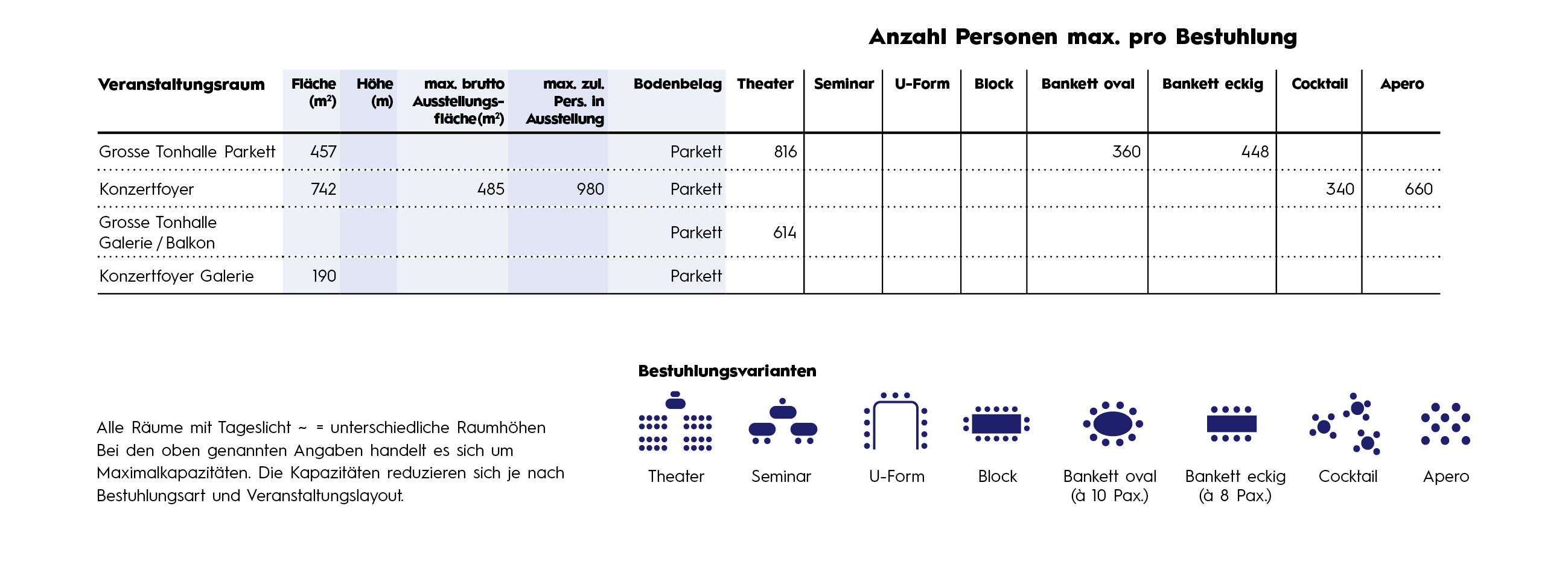 Die grosse Tonhalle gilt als einer der besten Konzertsäle der Welt. Nicht nur die akustische Brillanz überzeugt Besuchende aus aller Welt, sondern auch der historisierende Baustil. Die fünf auffälligen Deckenmalereien zeigen verschiedene musikalische Szenerien und machen den Besuch zu einem Gesamterlebnis für Augen und Ohren. Die festliche Ausstrahlung des Raums ist einmalig und ermöglichen Konzertbesuche für 1500 Personen. Zugänglich ist die Grosse Tonhalle über das Konzertfoyer, welches vor, nach und zwischen Konzerten zum Wandeln einlädt.
